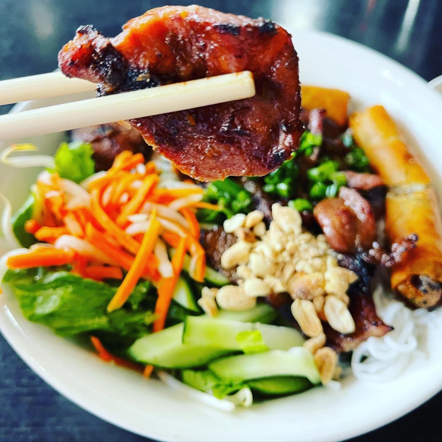 Rice vermicelli topped with savory grilled pork, crispy egg rolls, fresh herbs, and fish sauce.